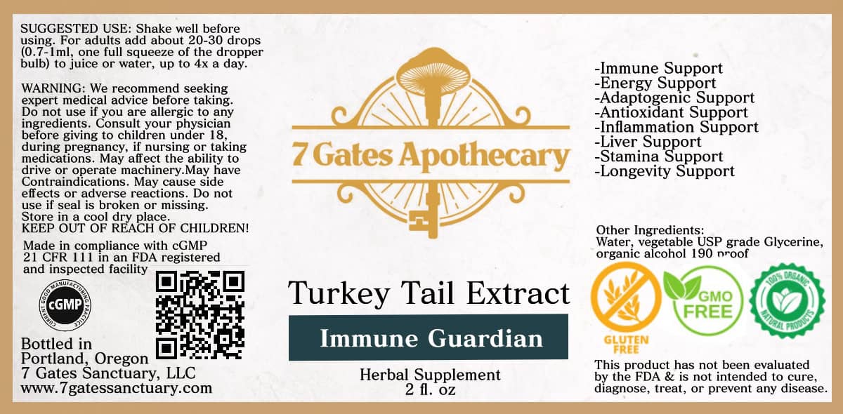 Ingredients: Turkey Tail Mushroom Extract, Water, vegetable USP grade glycerine, organic alcohol 190 proof